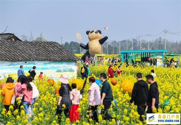 近日,位于四川成都崇州市的数万亩油菜花竞相绽放,吸引游客前来踏春观光。
