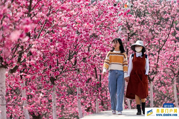 3月1日,两名游客在宜良县山后樱花谷观光直播。